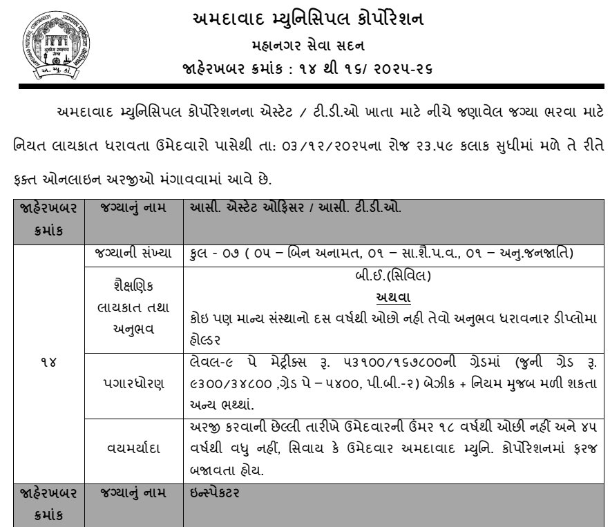The AMC is inviting online applications for various posts such as Assistant Estate Officer, Inspector, Sahayak Sub Inspector, Sanitation Superintendent, and more. Interested and eligible candidates can apply online through the official website. The application process is currently active and concludes on 03 December 2025. Below are the comprehensive details regarding vacancy distribution, eligibility criteria, salary structure, and application steps.