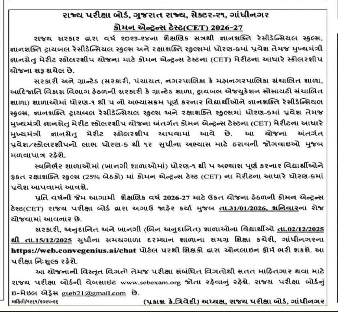 - Residential Schools (આશ્રમ શાળા, Eklavya, Model Schools વગેરે) માં Admission CET Merit પરથી થશે.